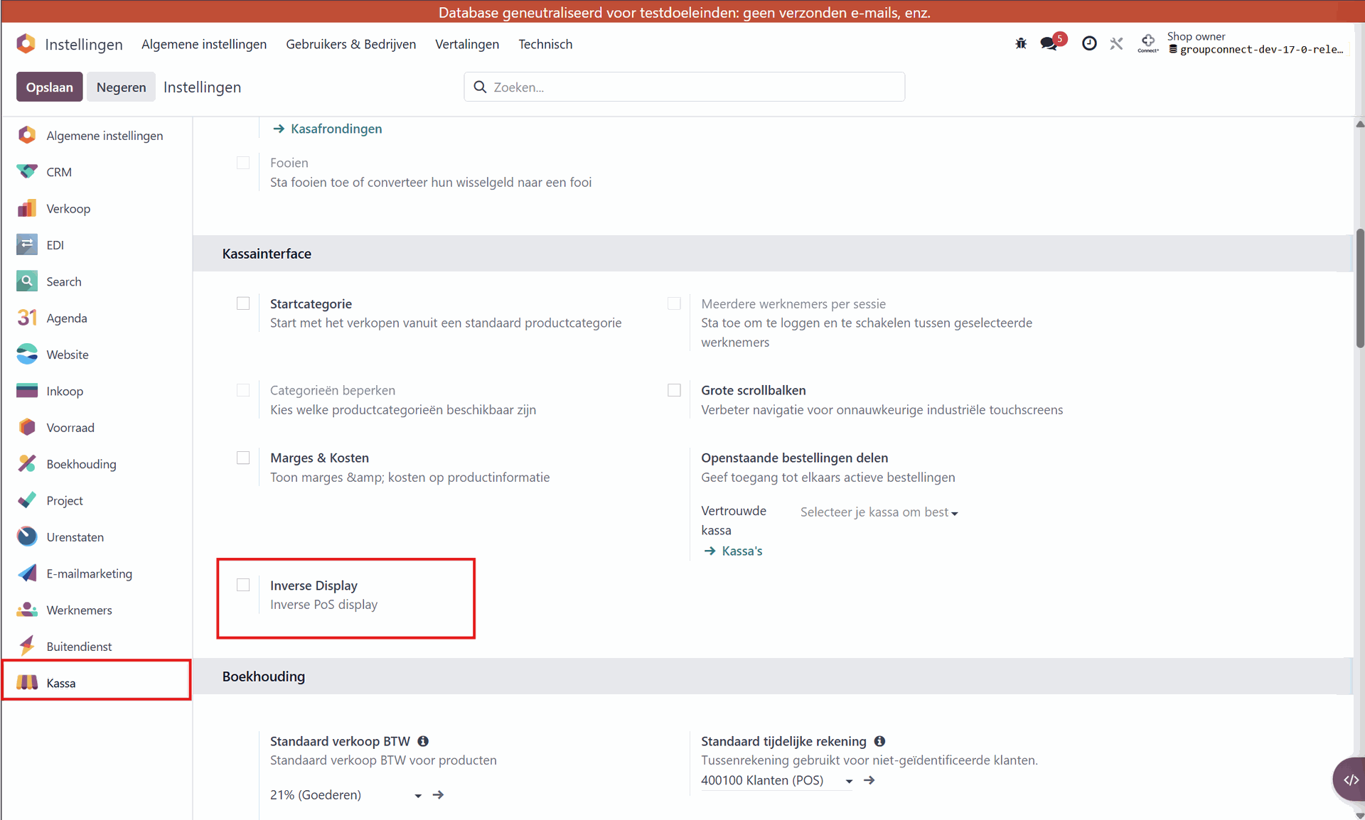 Je kunt er nu voor kiezen om de POS-interface om te gooien. Zo krijg je links de producten en rechts de orderlijnen en bewerkingsmogelijkheden te zien. Op deze manier kun je van links naar rechts werken in de kassa. Dat doe je door in de Instellingen-app → Kassa → "Inverse Display" te selecteren.